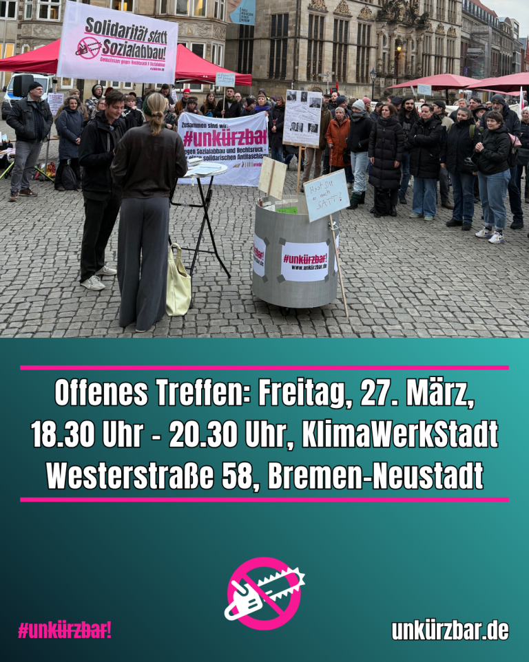 Unkürzbar ist ein Zusammenschluss von Aktiven aus solidarischen Gruppen, Betrieben und Gewerkschaften. Wir haben uns zusammengeschlossen, um auf den Sozialabbau in Bremen aufmerksam zu machen und uns gemeinsam gegen ihn zu wehren.