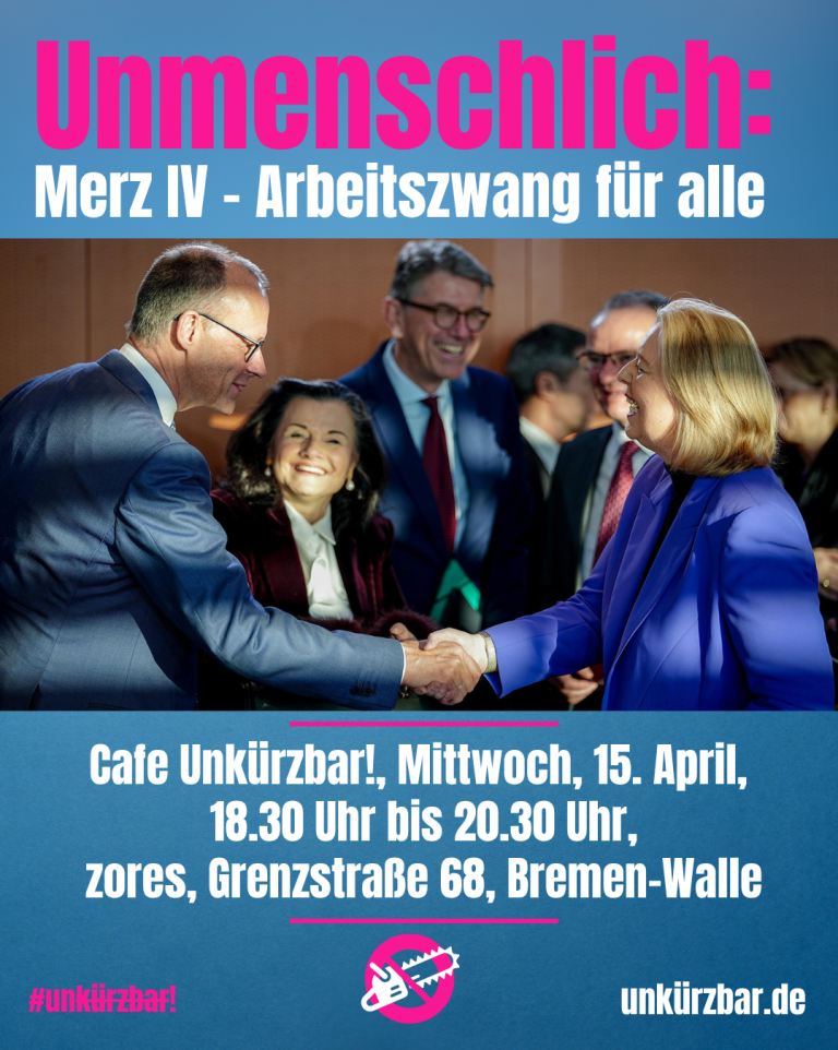 Wir laden euch ein zum „Café“ am 15.04.2026 18.30 bei zores, Grenzstraße 68, um mit euch über den Abgang des Bürgergeldes hin zum Grundsicherungsgeld zu diskutieren und dann gemeinsam schauen, was da geht.